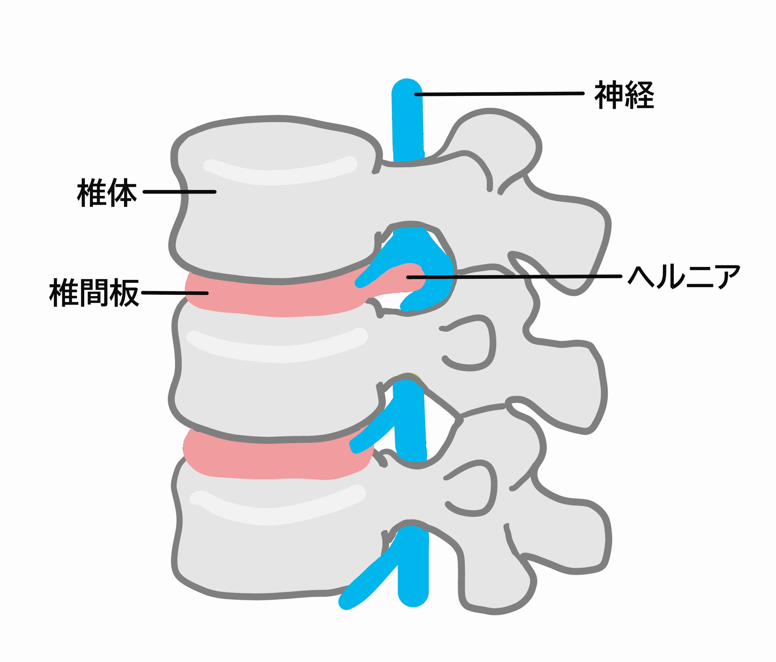 この椎間板の一部が飛び出して神経を圧迫している状態を「椎間板ヘルニア」と呼びます。