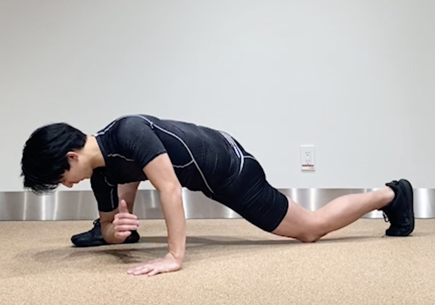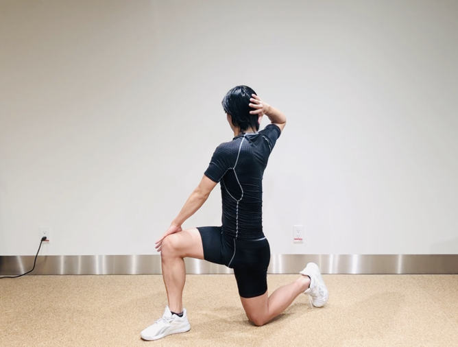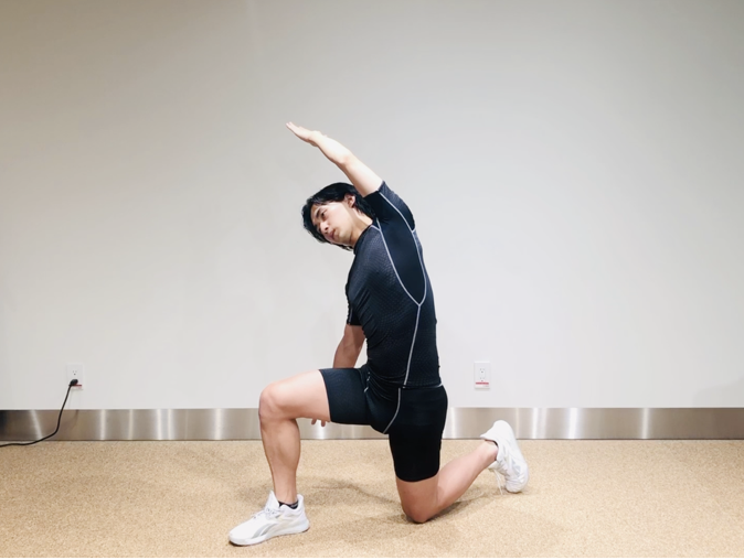 - 前脚を斜め前に出し、同じ側の肘を床に近づけて内ももを伸ばし、深呼吸×2回。