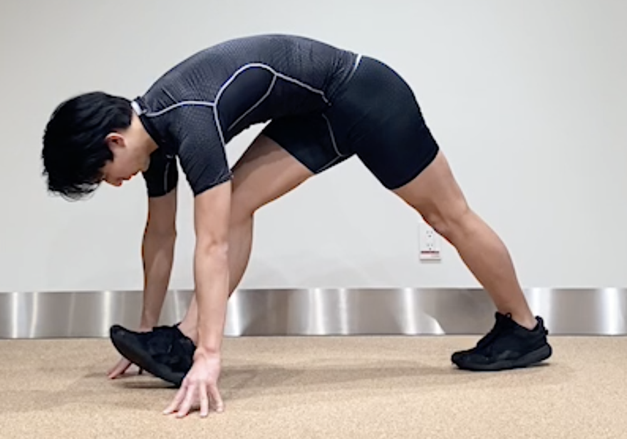 - 前脚を戻して両手を床につけ、両膝を伸ばす。
