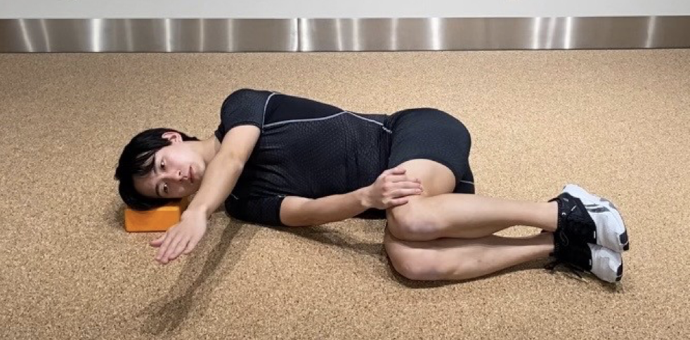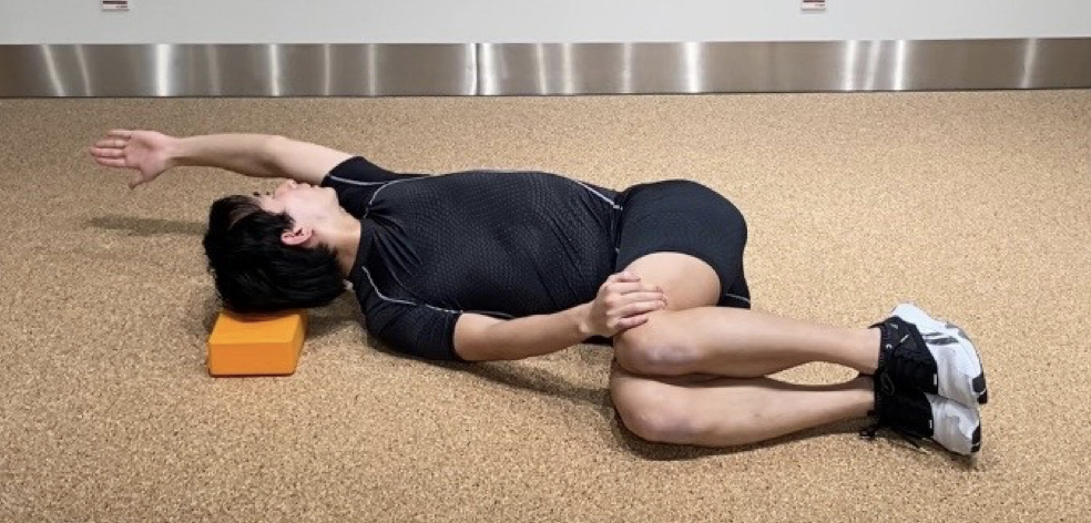 両脚を90度に曲げ、下の手で膝が動かないように押さえる。上の手は前に伸ばす。
