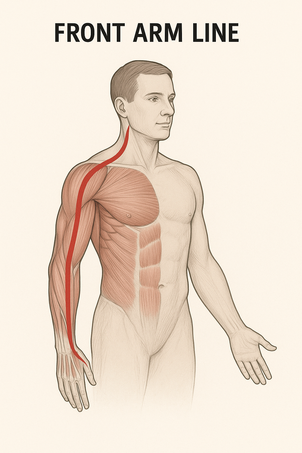 アームラインは、胸・肩・腕・手をつなぐ筋膜の連鎖で、特に「フロント・アームライン」が硬くなると、肩が前に引っ張られやすくなります。