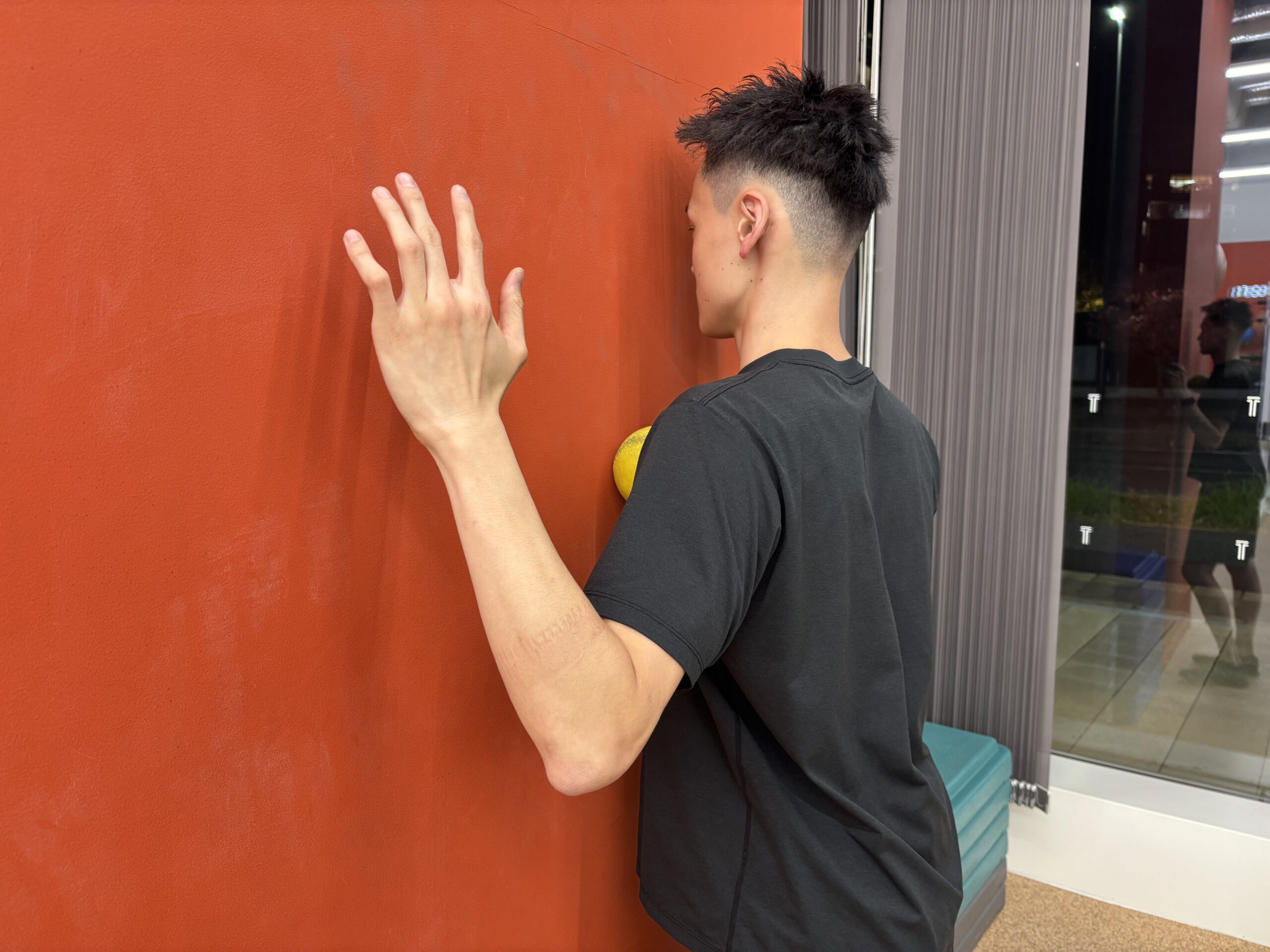 壁にソフトボールorテニスボールを当て、胸の前面をゆっくりと転がします。