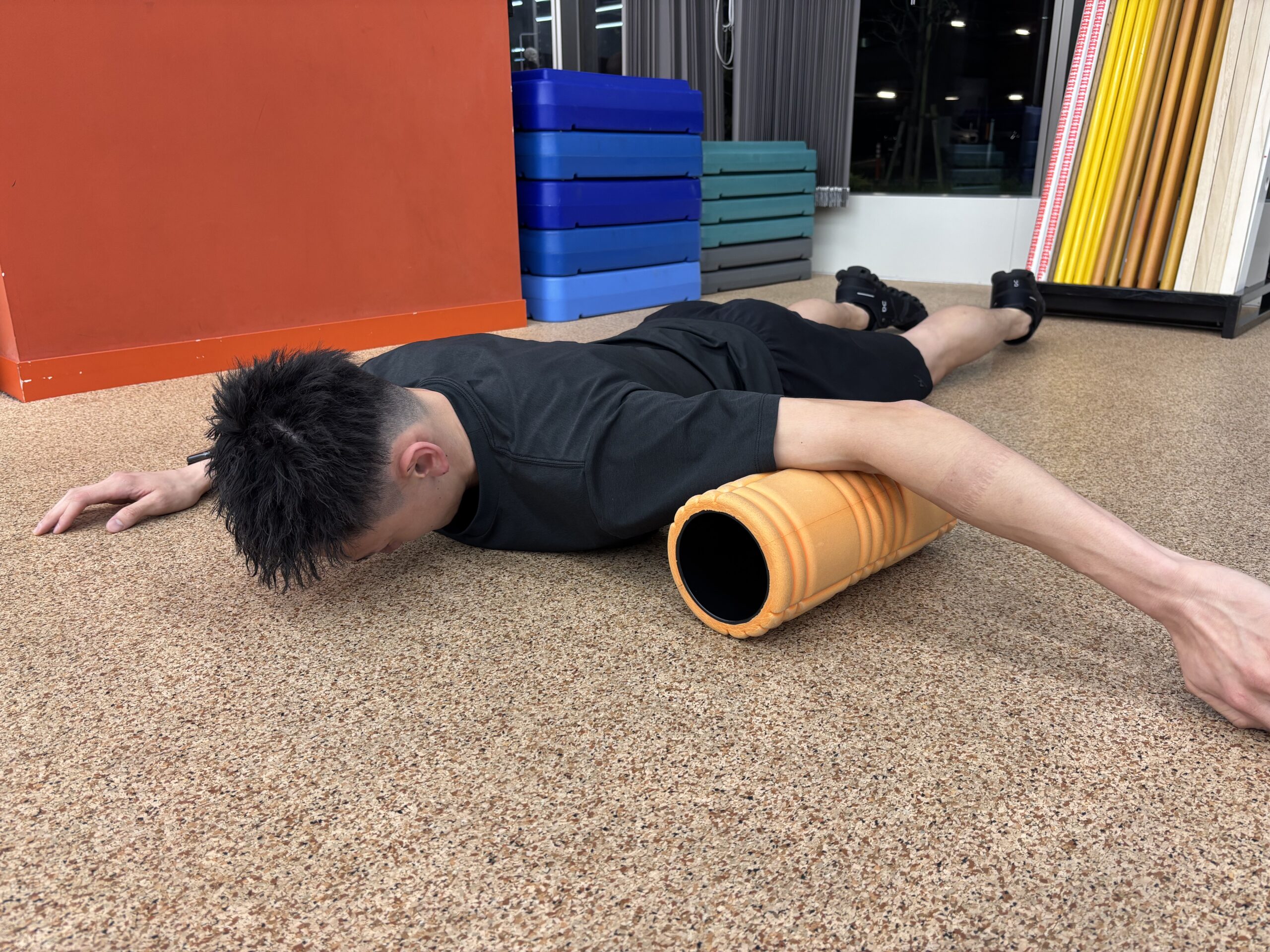 フォームローラーを使って、上腕の前側をゆっくり転がします。
