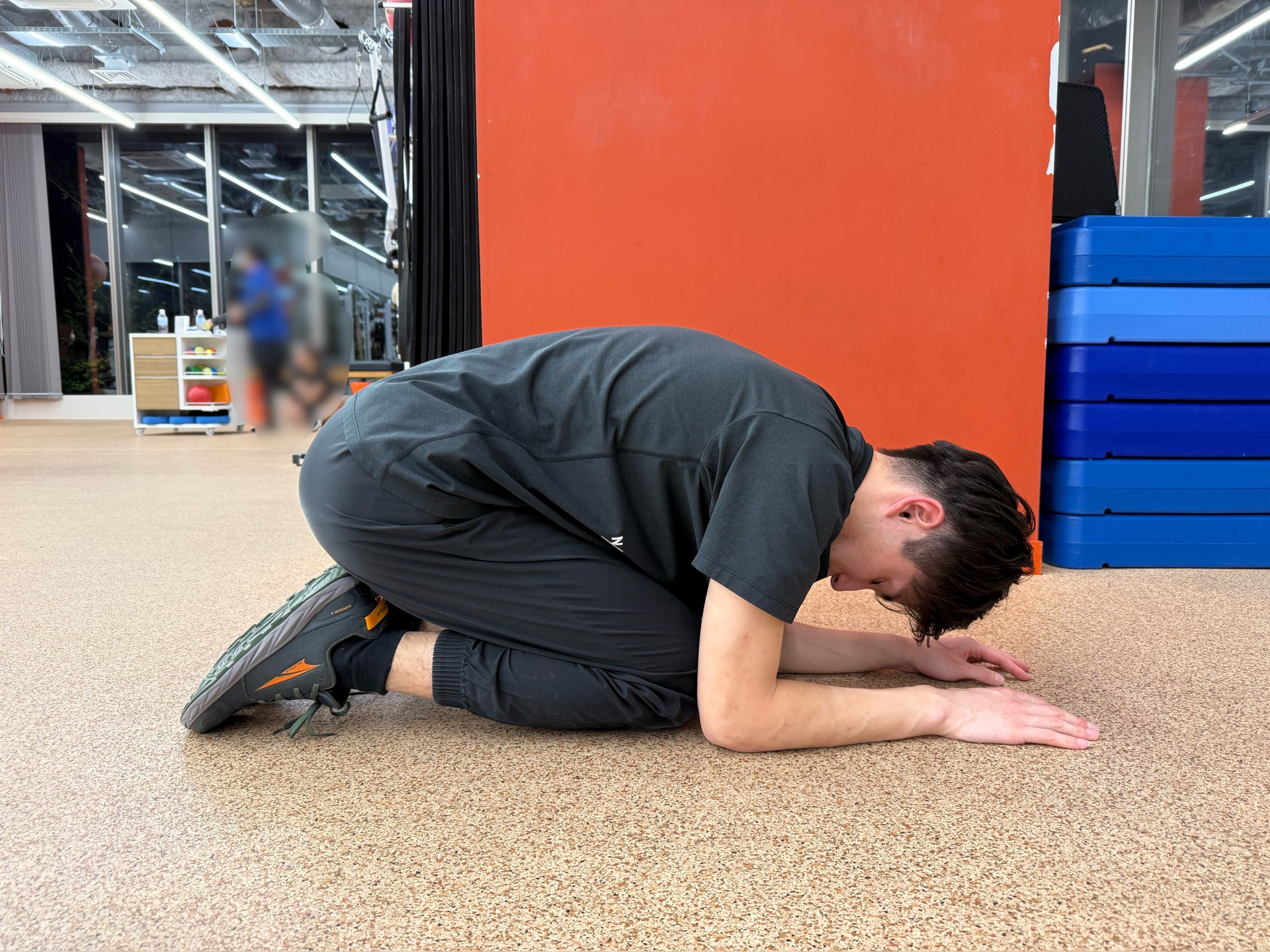 背骨を丸めて、5秒で吸って・5秒で吐いて・5秒止める呼吸を2分間行いましょう。