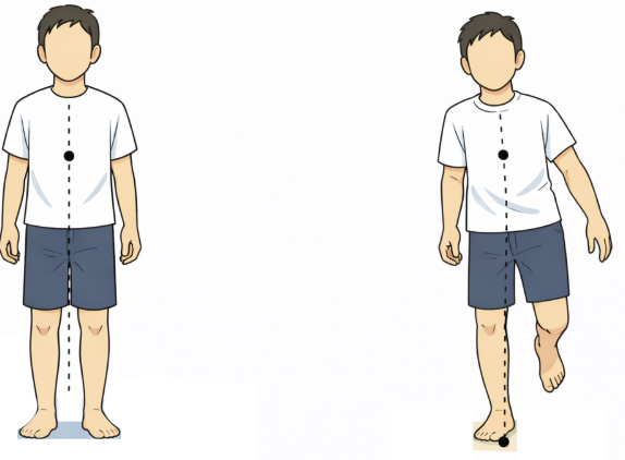 一方で、片足になると支持基底面は足裏1つ分にまで小さくなり、「許容される重心移動の範囲が極端に狭くなる」ため、姿勢の制御が一気に難しくなります。