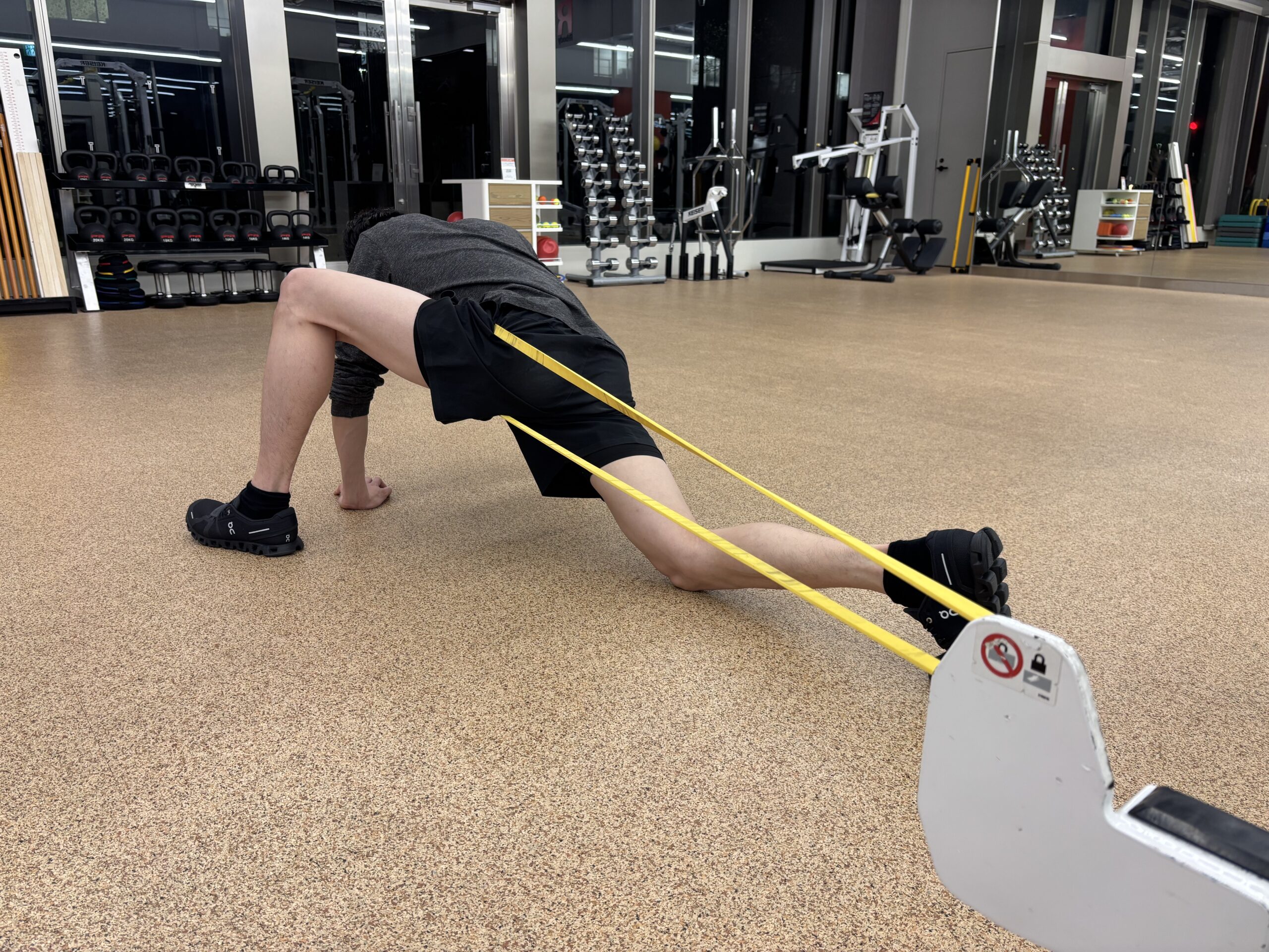 目的:バンドを用いて大腿骨の後方滑りをサポート