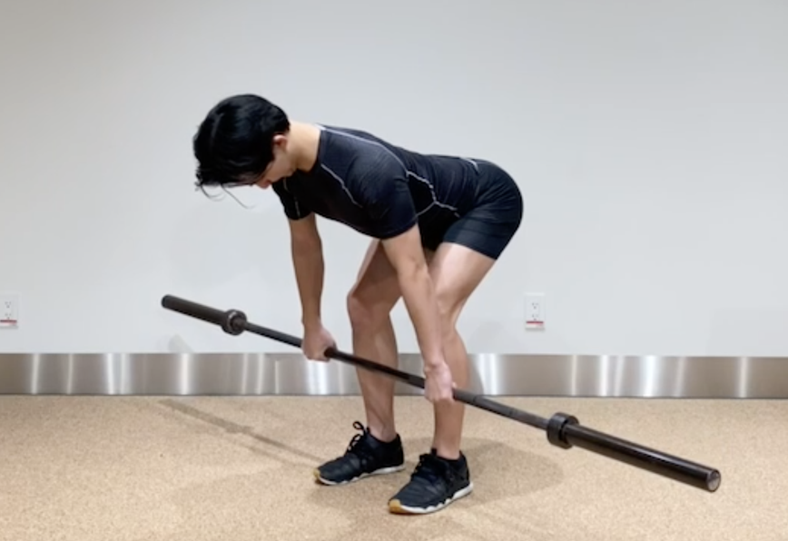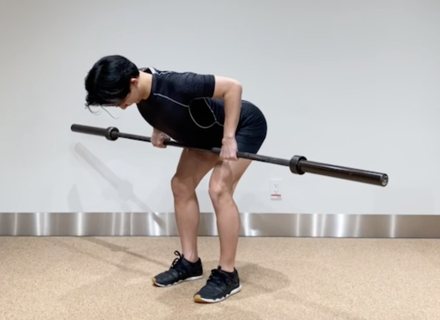 (バーの代わりに、棒や中身が入ったペットボトルでも実施できます!) - 膝を軽く曲げ、バーが膝下にくるまで上体を倒す。
