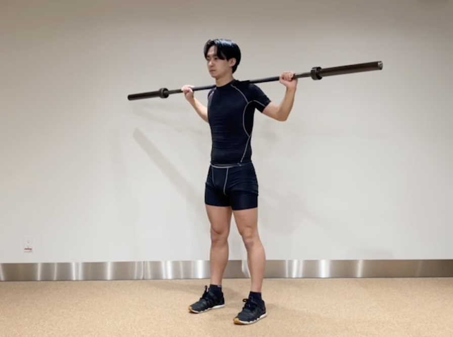 (バーの代わりに、棒や中身が入ったペットボトルでも実施できます!) - 足幅を骨盤幅に開き、足裏の3点(踵、母趾球、小趾球)に均等に体重を乗せる。