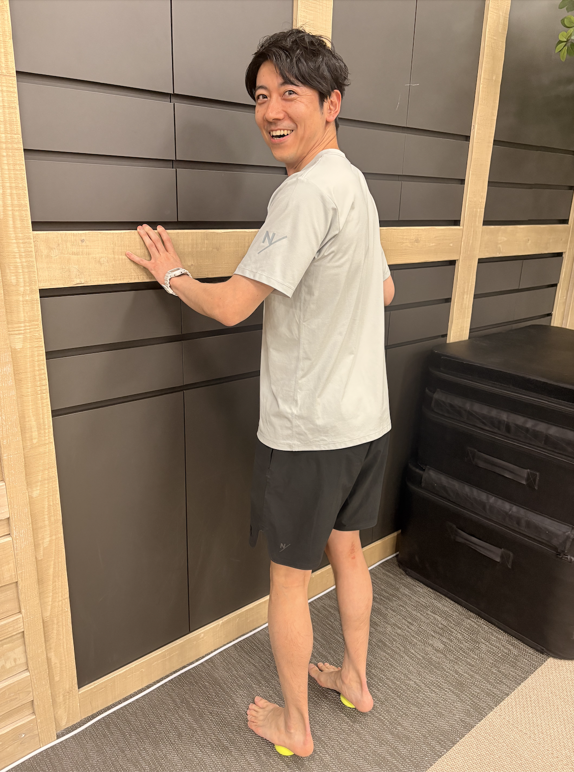 立位で行うエクササイズの前に、ニューロボールを踏んで刺激を入れたり、トレーニングマットの上でエクササイズを行ったりすることによって、関節を安定させることができ、運動の効果を引き出しやすいと言えます。