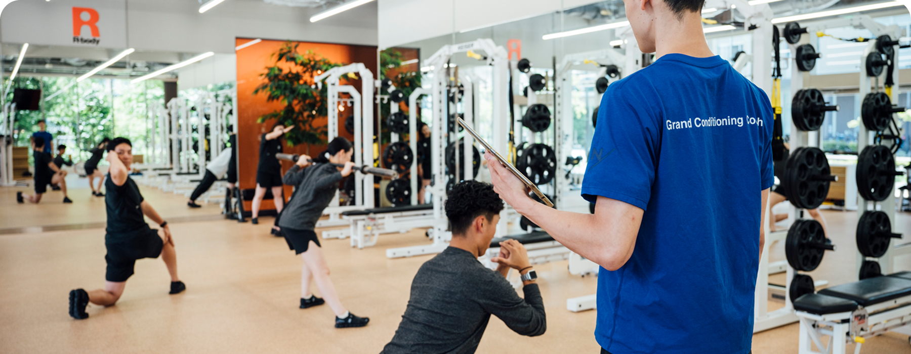 Details: By performing self-conditioning*, you will deepen your understanding of your own body, and therefore enhance the effectiveness of your training. At R-body, we also place a Grand Conditioning Coach on the conditioning floor to monitor and support your self-conditioning sessions. We aim to create an environment where everyone can feel supported in their training, even when working out by themselves.