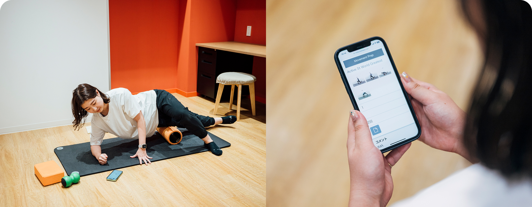 Details: A conditioning program that can be carried out at home or on a business trip. We use a cloud computing system that allows you to access photos and videos from your own conditioning program anytime, anywhere. You can record your training history and physical condition, and also use the memo function to access training tips from your coach for exercise programs you have performed previously.