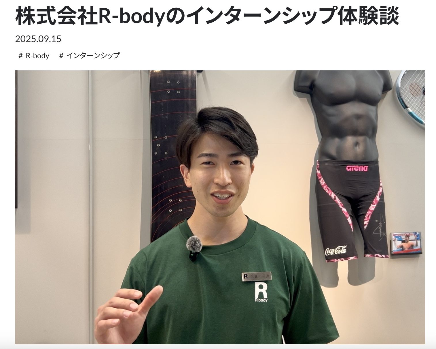 上能は自身がなぜコンディショニングコーチを目指したか、について学生時代を振り返りながら、特徴的なR-bodyのインターンシップについてもお話しさせていただきました。