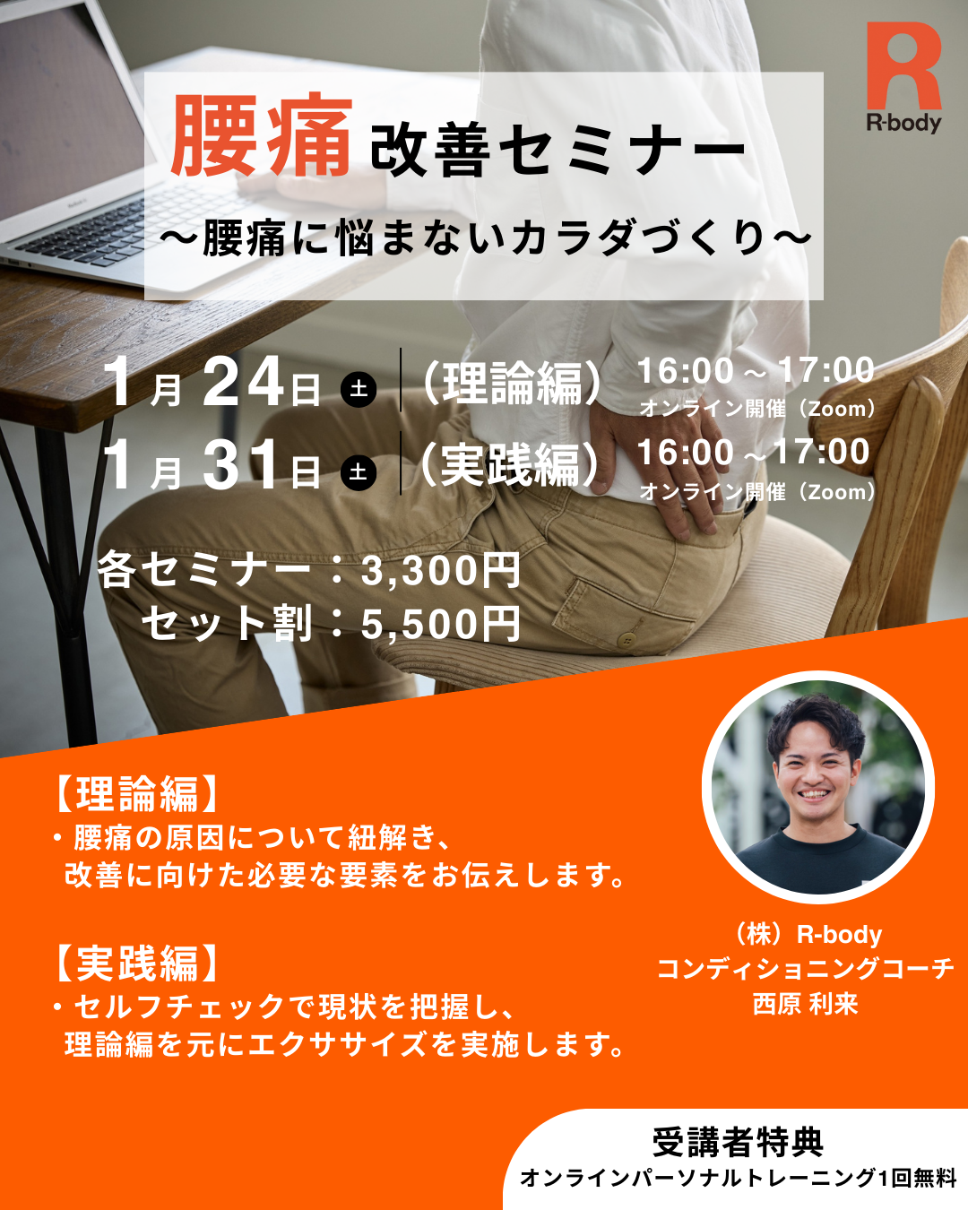 その場しのぎではなく、根本的な「腰痛に悩まないカラダ」を目指す方に向けたオンラインセミナーです。